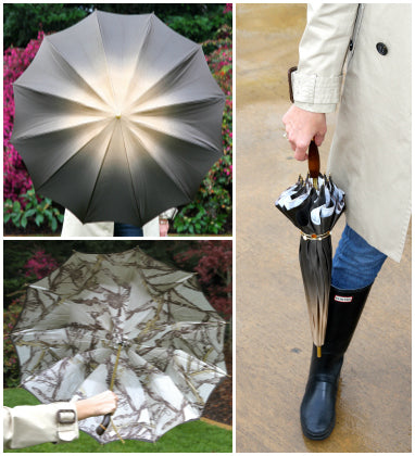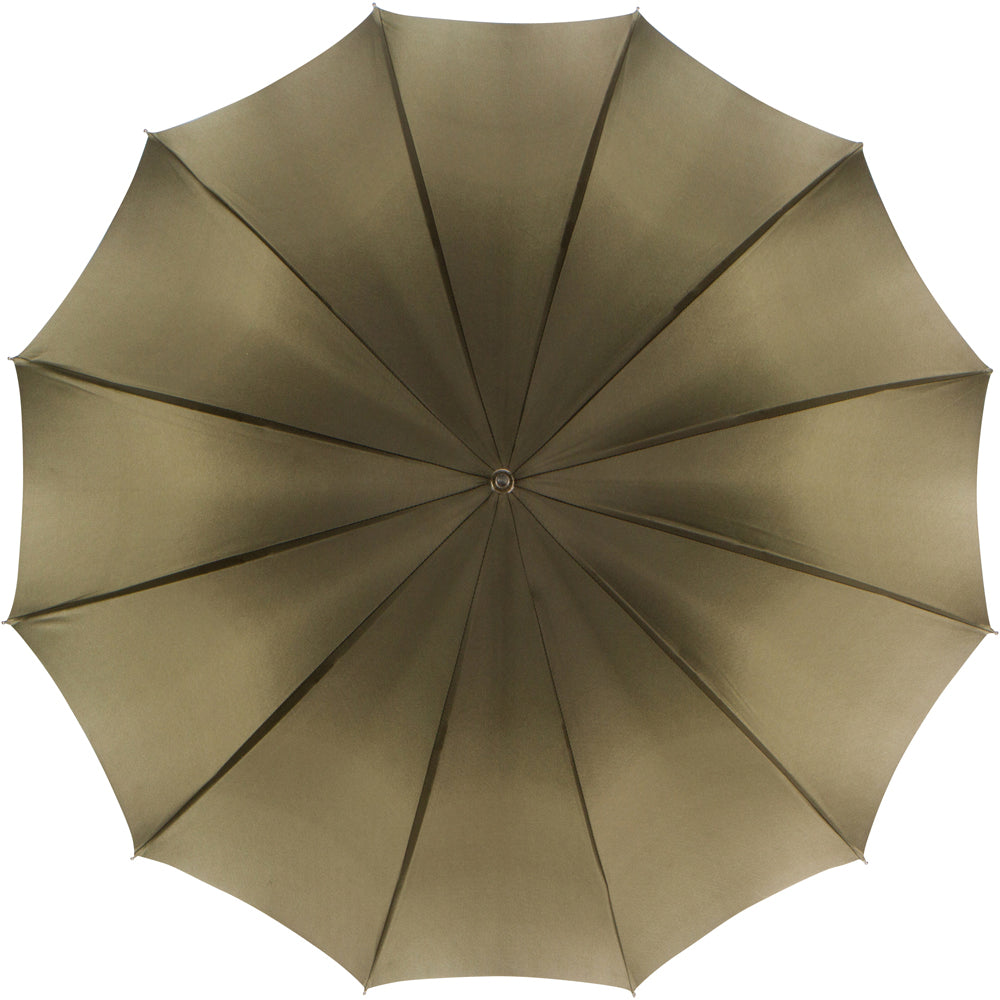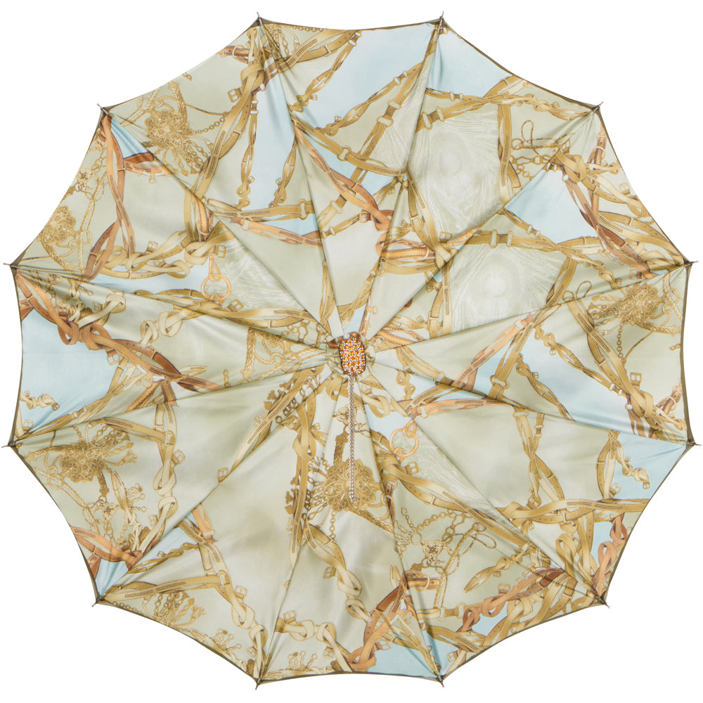 Olive ombré exterior with sky blue Hermès inspired interior. Shapely wood handle with Swarovski crystal accents. Genuine Swarovski crystal bracelet closure included. Our full size version has an overall length of 29" and a 30" diameter canopy. Made in Italy