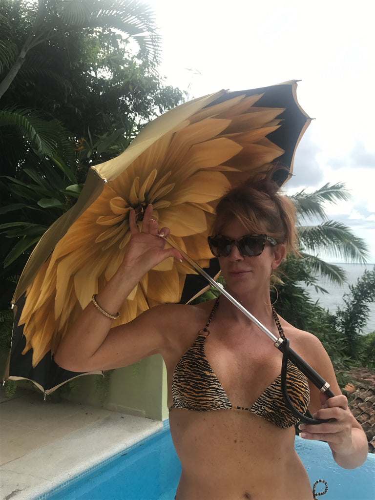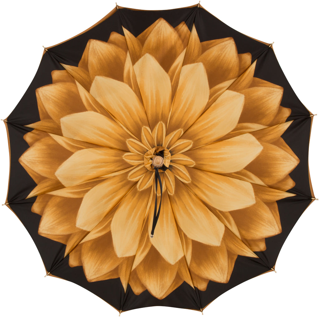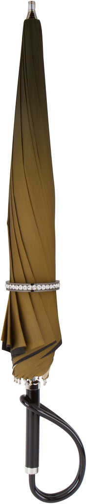 Gold ombré exterior with gold flower interior and looped lucite handle. Genuine Swarovski crystal bracelet closure included. Our full size version has an overall length of 27" and a 30" diameter canopy. Made in Italy